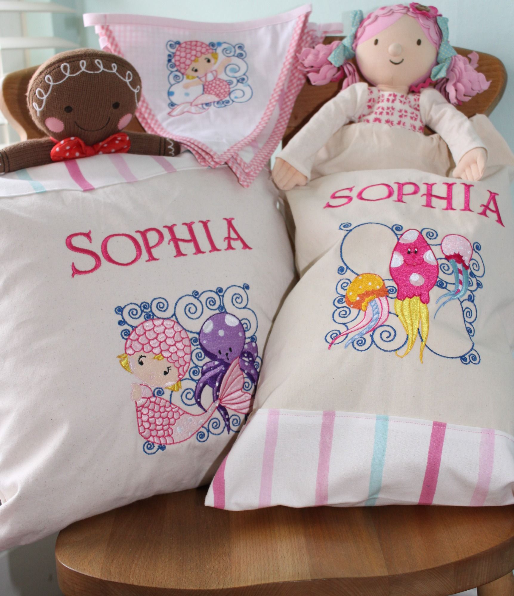 Dive under the sea with this gorgeous little mermaid and friends. This will brighten up any child's bedroom and add a name for that personal touch!! Embroidered in bright and Zingy colours and co-ordinated to make this design truly make a splash. Bunting comes complete with Free Gift Bag.